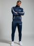 Das Design überzeugt durch klare Linien und einen modernen Slim Fit Schnitt, der eine sportlich-maskuline Silhouette unterstreicht. Die navyblaue Grundfarbe wird durch die markanten weißen Streifen an Armen und Beinen perfekt ergänzt ein zeitloser Look, der sowohl im Gym als auch in der Freizeit funktioniert. Die Jacke mit durchgehendem Reißverschluss ist praktisch und stylish zugleich, während die Hose mit schmal zulaufendem Bein am Knöchel modern abschließt und für einen eleganten Sitz sorgt.
